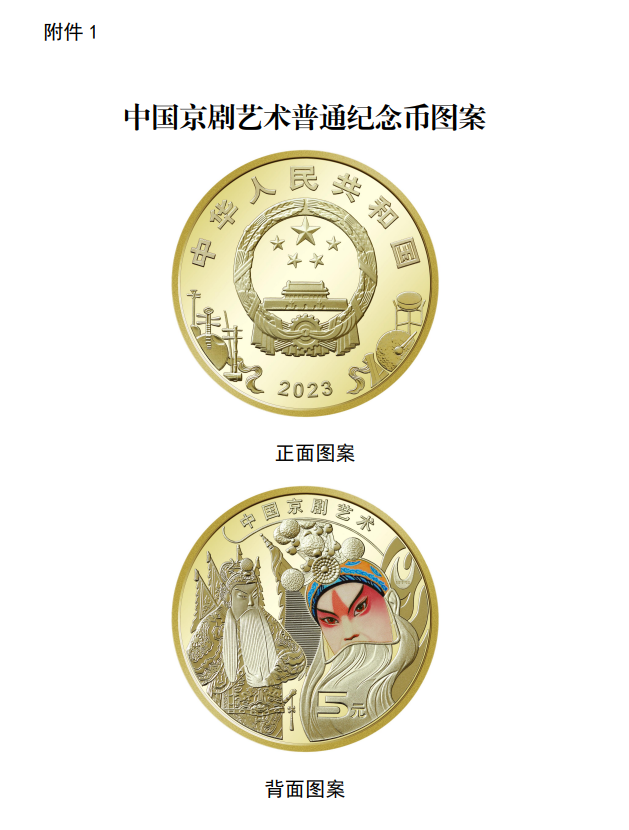 据悉,中国京剧艺术普通纪念币正面主图案为中华人民共和国国徽,国徽上方刊“中华人民共和国”国名,下方刊年号“2023”字样,辅以中国戏曲乐器图案;背面主图案为中国京剧艺术中生角形象,局部为彩色图案,辅以装饰化图形,并刊“中国京剧艺术”及面额“5元”字样。
