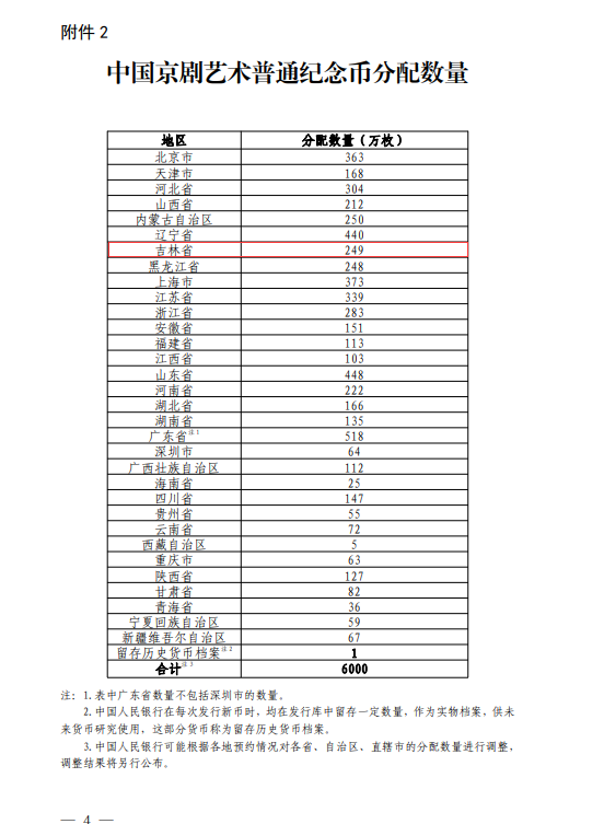 根据各省、自治区、直辖市的分配数量,中国京剧艺术普通纪念币在吉林省分配数量为249万枚。