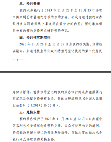 记者注意到,此次中国京剧艺术普通纪念币每人预约、兑换限额为20枚。预约承办银行于2023年11月22日至11月23日办理中国京剧艺术普通纪念币的预约业务。公众可通过预约承办银行官方网站等线上渠道或在营业时间内前往预约承办银行公布的预约兑换网点进行预约登记。与此同时,预约承办银行于2023年11月28日至12月4日办理中国京剧艺术普通纪念币预约兑换。