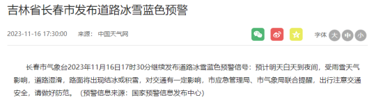 长春市气象台2023年11月16日17时30分继续发布道路冰雪蓝色预警信号:预计明天白天到夜间,受雨雪天气影响,道路湿滑,路面将出现结冰或积雪,对交通有一定影响,市应急管理局、市气象局联合提醒,出行注意交通安全,请做好防范。