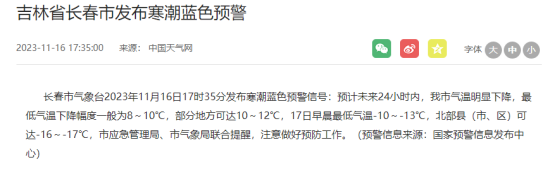 长春市气象台2023年11月16日17时35分发布寒潮蓝色预警信号:预计未来24小时内,长春市气温明显下降,最低气温下降幅度一般为8~10℃,部分地方可达10~12℃,17日早晨最低气温-10~-13℃,北部县(市、区)可达-16~-17℃,市应急管理局、市气象局联合提醒,注意做好预防工作。