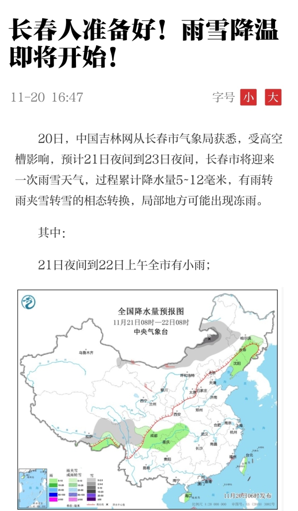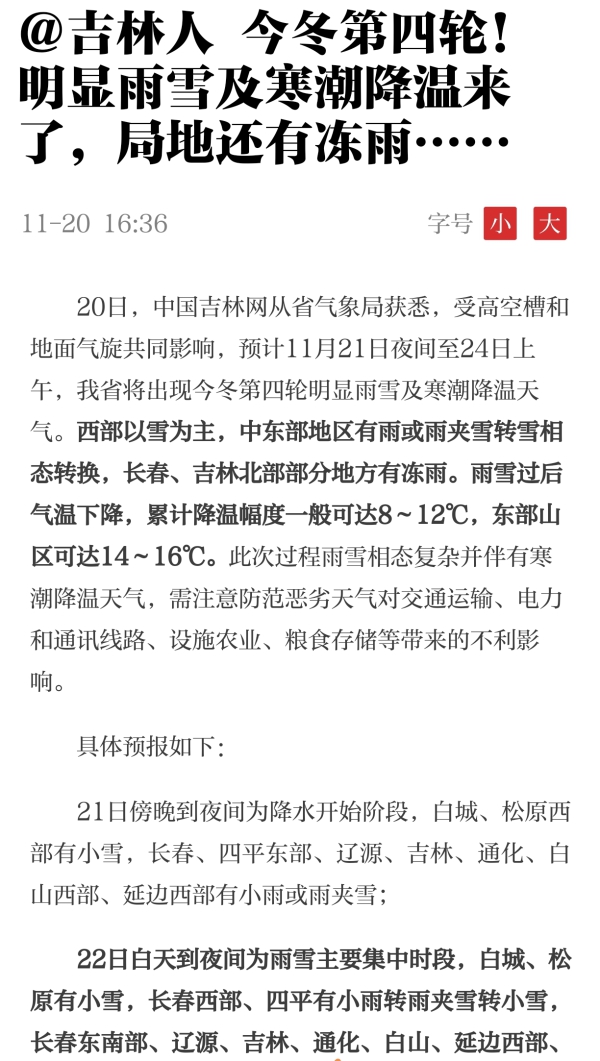 20日,中国吉林网从省气象局获悉,受高空槽和地面气旋共同影响,预计11月21日夜间至24日上午,我省将出现今冬第四轮明显雨雪及寒潮降温天气。