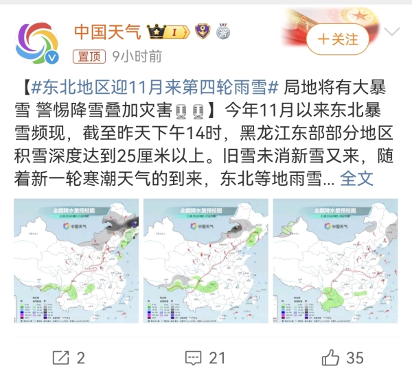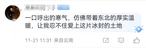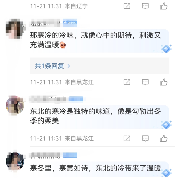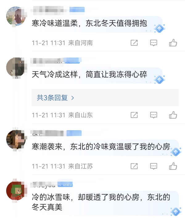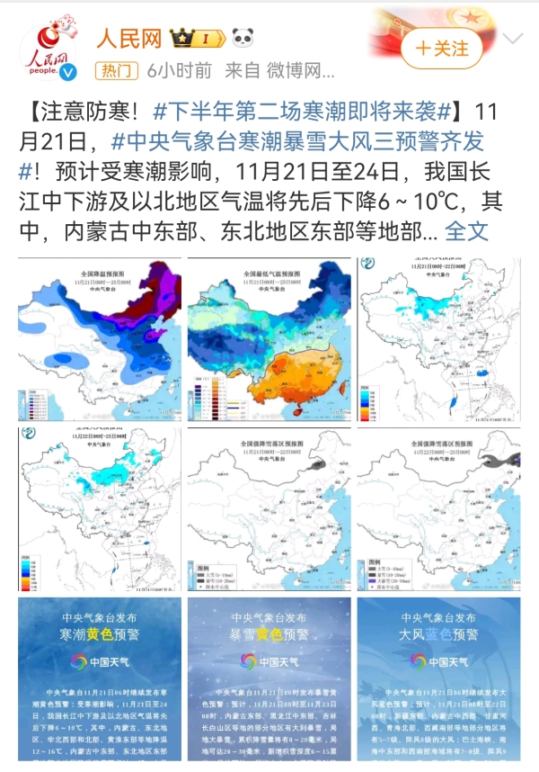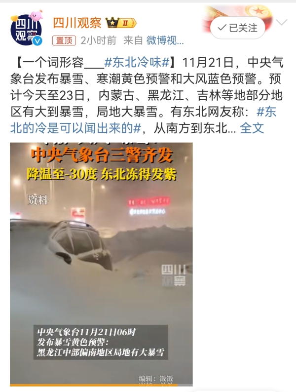 11月21日,中央气象台发布暴雪、寒潮黄色预警和大风蓝色预警。预计今天至23日,内蒙古、黑龙江、吉林等地部分地区有大到暴雪,局地大暴雪。有东北网友称:#东北的冷是可以闻出来的#,从南方到东北,落地呼吸那一刻,冷味可太纯正了。