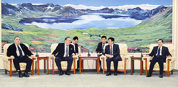 12月7日,省委书记巴音朝鲁、省长蒋超良在长春会见了由“格鲁吉亚梦想”联盟政治委员会成员、伙伴基金主席大卫•萨加涅利泽率领的格鲁吉亚执政党干部考察团。 记者 宋锴 摄