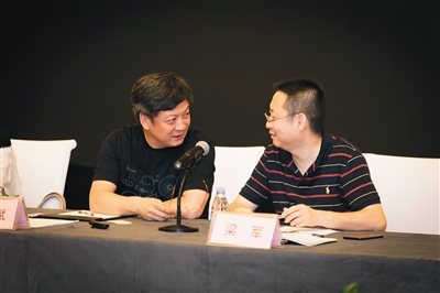 昨日股东大会上,孙宏斌和梁军交谈。乐视供图