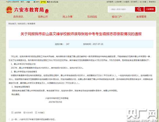 今天中午,央广网记者在六安市教育局官方网站首页看到,该局就此事发布了一则题为《关于网报我市霍山县文峰学校教师误导张姓中考考生填报志愿录取情况的通报》通报说明。