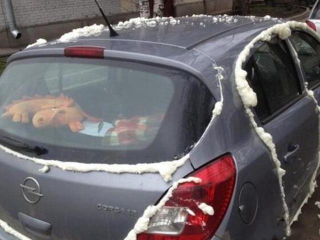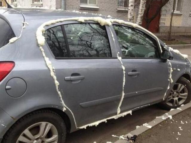 这是俄罗斯的一位车主的欧宝,据说是没有车位了就随便停了一个地方,结果再次用车的时候发现,车上全是“奶油”,不过这只是车主以为,走近了看根本不是奶油,而是在车上的各个缝隙处都挤入了泡沫胶,粘性是相当大的,对于这样的破坏,专业的维修清理人员也表示很无奈。