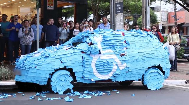 还有一位巴西车主,把爱车停在了残疾人专用车位上,于是热心的“便利贴路人”给他的车贴满了便利贴,而且还利用便利贴的颜色贴出了一个残疾人的图标,目的很明显是用来嘲讽这位车主的,现场引来了相当多的群众围观拍照,可以说是大快人心的。