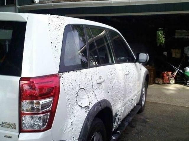 还有一些停放在别人店门口,妨碍别人做生意的,这辆SUV估计是堵住了五金店的门口,车身漆面直接被液体腐蚀掉了,真的够狠的。
