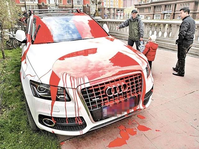 而我国最传统的警示方法,这次在一辆奥迪上也得以实现,在一个小区的通道上,这辆车被泼满了红色油漆分外刺眼,而且油漆已经干掉了,车主估计死的心都有了。