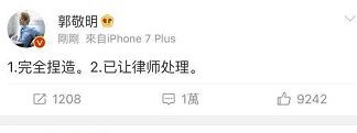 随后,郭敬明对此进行回应,称此事完全捏造,已经让律师处理。