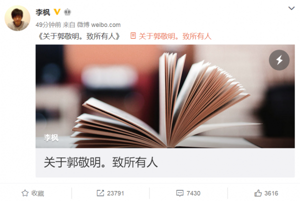 8月21日,作家李枫在微博上发文称,他曾遭郭敬明同性性骚扰,还称郭敬明经常骚扰、性侵犯签约到郭敬明公司的男作者、公司的男性职员,更呼吁社会各界的网友们一起探讨这些事情。据悉,李枫已出版长篇小说《召唤喀纳斯水怪》《燃烧的男孩》《圣地》。