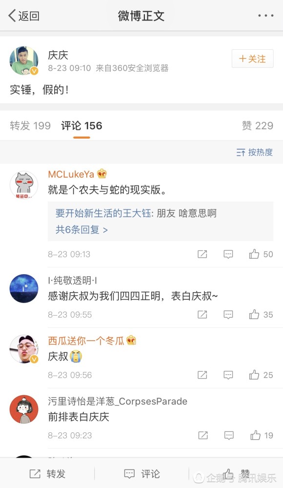 腾讯娱乐讯(文/小西)8月21日,作家李枫在微博发长文爆料郭敬明曾对自己性骚扰,同时表示:“他经常性骚扰、性侵犯签约到他公司的男作者、公司的男性职员。”8月23日上午,郭敬明前生活助理庆庆发声力挺郭敬明,发微博称:“实锤,假的!” 据悉,庆庆原名李庆根,是李枫自称被性侵那段期间,郭敬明的生活助理。自事件爆发后,最近两天郭敬明一直处于风口浪尖,旗下众多签约作者也频频上热搜,但却无一人为其发声。看到庆庆的微博,郭敬明的很多粉丝都表示十分感动,ID为“纯敬透明”的网友留言:感谢庆叔为我们四四正明,表白庆叔。网友“喵宁小姐与你”也表示:感动了,不管有多少人唾骂他背叛他不相信他 最初的朋友都还在他身边啊。 关于此次事件,郭敬明本人曾在微博简短回应:“1.完全捏造2.已交由律师处理。”不过李枫在接受媒体采访时却表示,目前郭敬明方面的律师尚未联系他,而自己也并非临时起意发的微博。谈及为何几年前的事情如今才选择发声,他表示:“这件事我经过深思熟虑了,我认为必须要这样了,想保护其他不知情的人。我没有任何不好的动机,这件事是必须要做的。” 据了解,目前李枫正在积极调整并准备应对接下来即将面对的事件进展,也希望社会各界人士能予以援手。