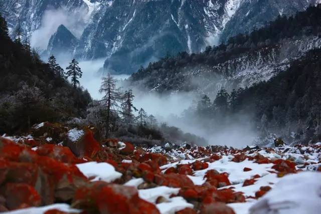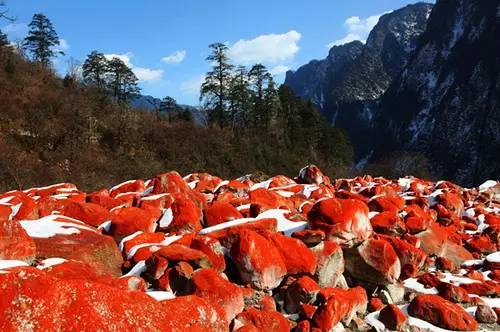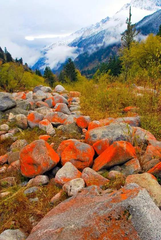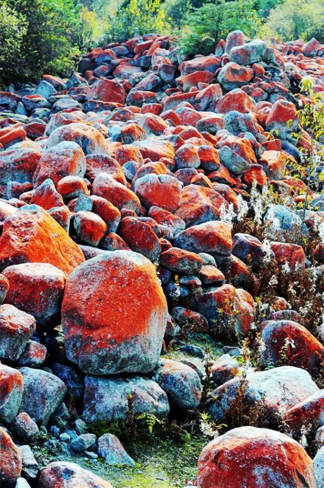 但是,毕棚沟似乎还嫌不够,在绚烂的秋季里又加入了新鲜的颜料,红的似血的红石滩,透明的冰川,全部加入到了秋天的行列中,美的更加动人心弦。
