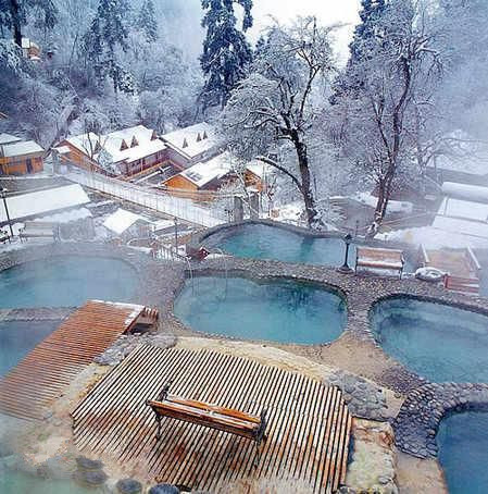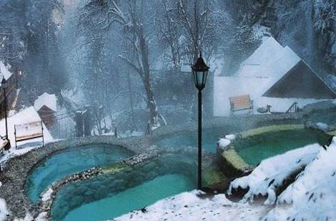 你若是选择冬天来泡温泉,这里的景象则更妙了,蒸腾的雾气映照着白雪,红叶与白雪相互映衬,如梦似幻,如仙境一般美丽。