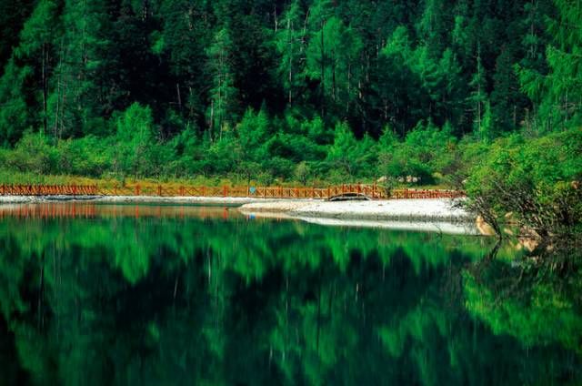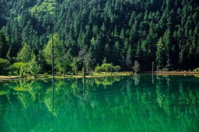 它的水宛若一颗翡翠,镶嵌在深山里,静静的映照着天地间的美景。若是春夏季前去,碧水映着周边的绿树,更是美得过分。