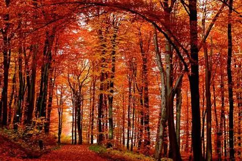 这里处处是一片五彩斑斓的世界,两旁的枫树、槭树、桦树、鹅掌松、落叶松等渐次经霜,树叶被染成为绮丽的鲜红色和金黄色。
