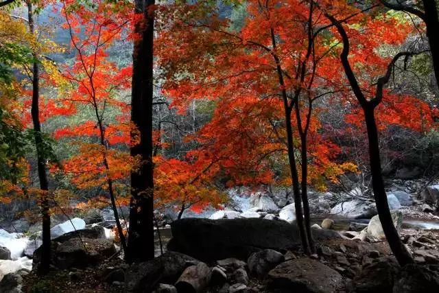 山川泉水间,到处都是娇艳似火的枫叶,徜徉其间,有如置身“火”的世界。