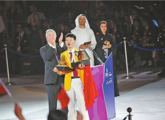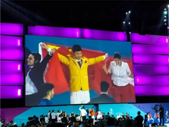 身穿黄色上衣、白色长裤的中国选手们一次次登上领奖台。他们欢呼雀跃与其他获奖选手击掌拥抱,把手中的五星红旗或高举过头顶或挥舞在胸前,展现了新一代“中国工匠”朝气蓬勃的精神风貌。