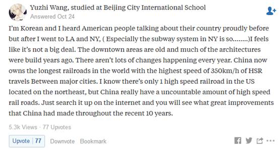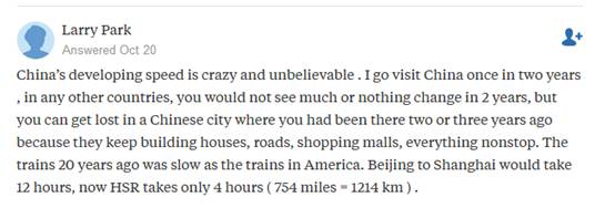网友Larry Park:“中国的发展速度很疯狂且难以置信。两年前我去过中国,在其他国家,两年之内你不会看到太多变化,但你可能会在2到3年前来过的中国城市里迷路。因为他们一直在不间断地建房子、修路、建购物中心。20年前的中国火车和美国火车一样慢,北京到上海要12小时,现在高铁只要4个小时。”