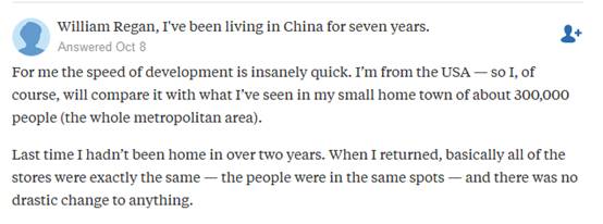 住在中国已经7年的网友William Regan也给出了类似的回答。他说:“对我而言,中国的发展速度非常快。我来自美国,所以自然会把她和我那拥有30万人口的家乡做一下对比。”