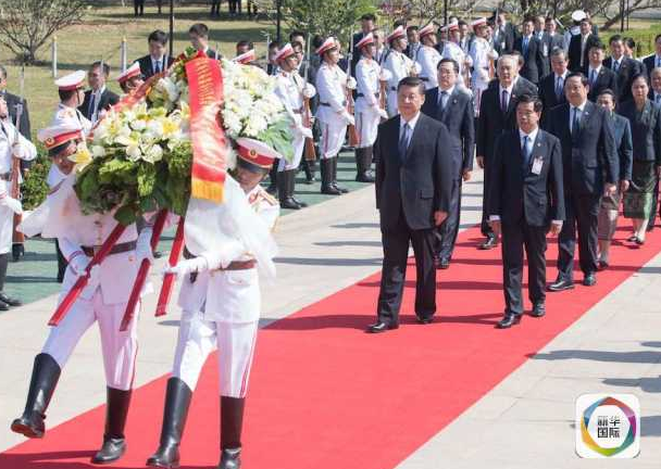 访问中,习近平抚今追昔,重温双方老一辈领导人友好交往的历史,回顾双方人民彼此支援的经历,向胡志明主席陵、老挝无名战士纪念碑献花圈。