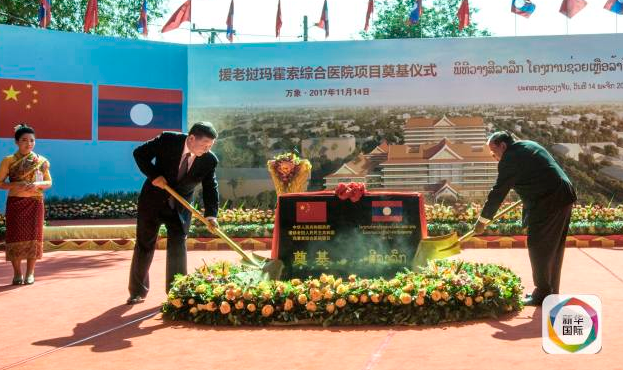 在万象,习近平同老挝人民革命党中央委员会总书记、国家主席本扬一道出席中国为老挝援建的民生领域标志性项目玛霍索综合医院奠基仪式。
