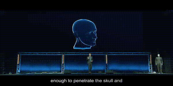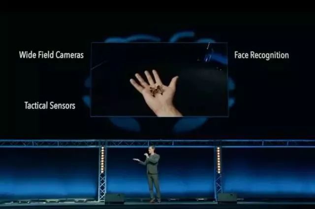 一个体型类似蜜蜂的小型机器人飞入会场并轻易躲过演讲人抓捕,其拥有 anti-sniper 技术,完全基于 AI。