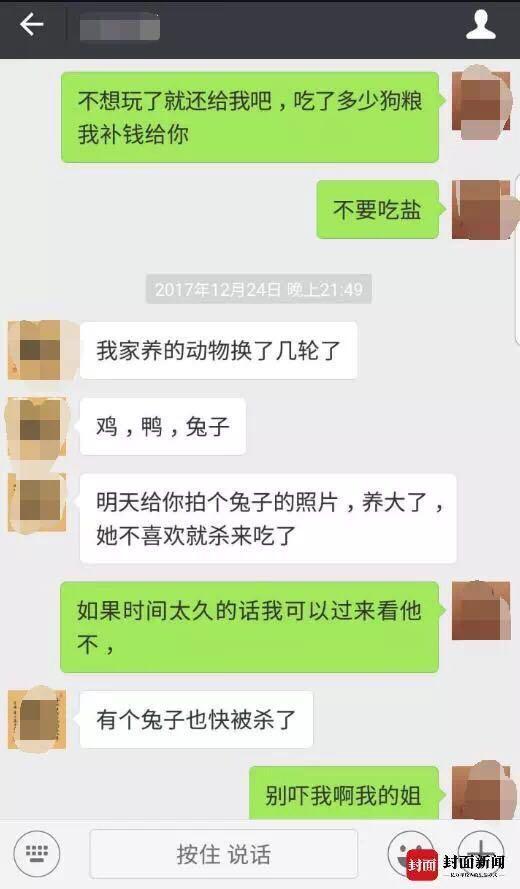 吴女士在对话中,多次央求何某,希望对自己的莱恩小狗好一点,不要伤害它。从聊天记录看,何某多次明确,要求小吴“转生活费过来”“给你喂好点”。在几次明确提出要钱的聊天过程中,何某不知出于什么原因,对小吴有挑逗戏弄的意味:“你有很多钱嘛,很多吗?”“我问她(小女儿),要活的还是死的,一句话……我女不喜欢了,就杀了啊。目前很喜欢……”