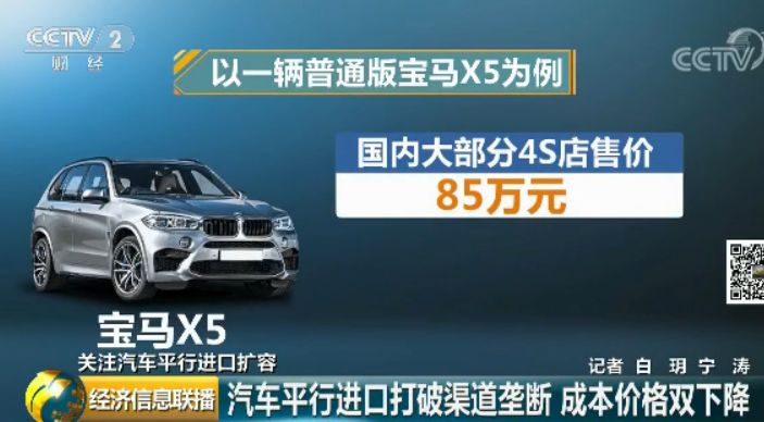 据商务部实地调研显示,中高端进口汽车价格下降明显,大部分车价下降了15%以上。以一辆普通版宝马X5为例,国内大部分4S店售价为85万元,而在天津保税区,相似款平行进口宝马X5售价为65万元左右。