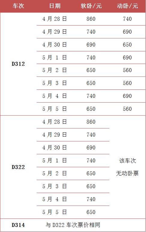 4月28日-5月5日,上海-北京的D312、D322、D314车次票价均有不同程度的浮动。其中,D312车次票价已出现4种不同的价格,软卧价格差在210元,动卧价格差在180元。