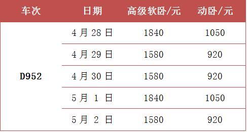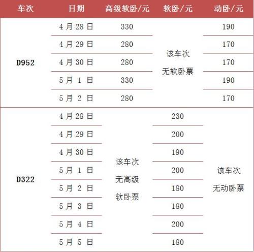 4月28日-5月2日,上海-成都D952车次的高级软卧票价差达260元,动卧票价差达130元。5月3日-5月5日的高级软卧及动卧价格均与5月2日一致。