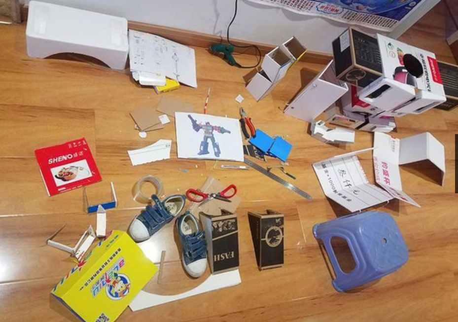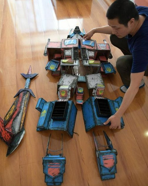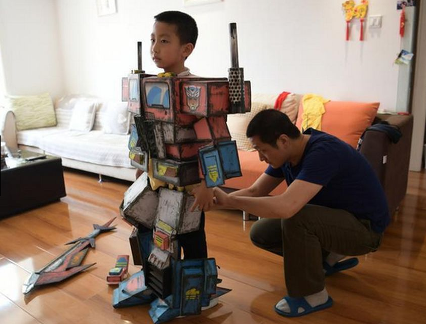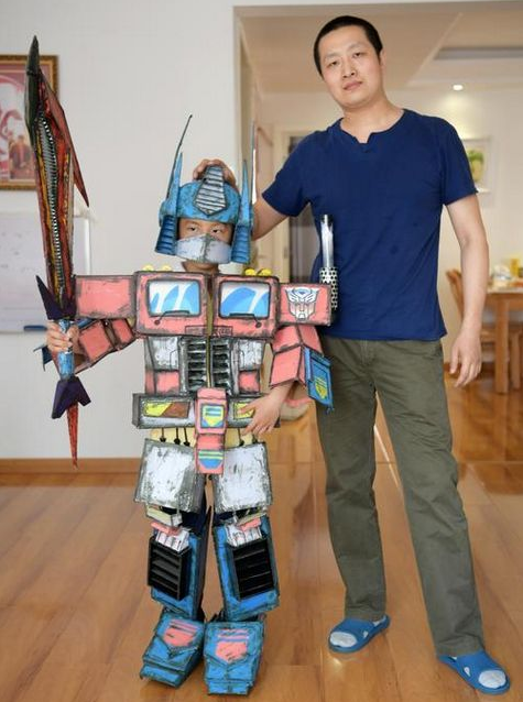 一年级的儿子“六一”要表演“汽车人”,80后的爸爸趁着休息间隙,耗时100个小时,用了六个纸箱、50根热熔胶,自己画图纸,量身定制为儿子打造了一套“变形金刚”擎天柱的盔甲,穿上它可以自由活动进行各种表演,预演的时候惊呆了小伙伴们。