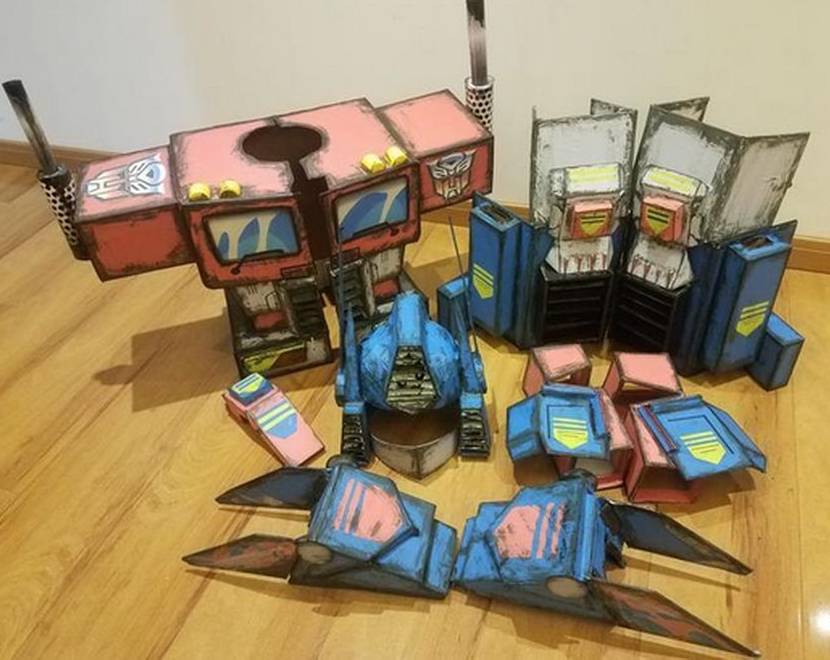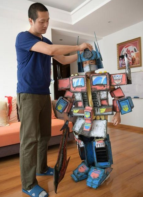 做好了“擎天柱”之后,就是试穿环节,刚开始儿子穿上后,不是胳膊处被卡住了,就是膝盖部位连接不好无法自由行走,经过不停地反复试验和测量,刘炜终于为孩子定制了一套“一比一”真人大小的擎天柱外衣,穿上可以自由活动随心表演。变形金刚完成之后,儿子迫不及待穿上,大喊“开始变形,出发吧”,在房间里进行各种表演。刘炜把制作的过程一步步拍摄下来,分享到朋友圈,希望可以给别的爸爸一点思路,同时他也希望留个纪念,让孩子长大以后看有个美好回忆。说到手工制作,这已经不是这位文科爸爸的处女秀了,早在之前为了能让儿子吃到无添加的安全棉花糖,他就自己动手为儿子做过棉花糖机。