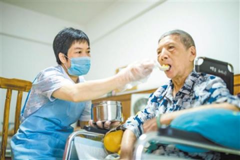 给无法自理的老人喂饭是养老院护理员的主要工作之一。广州日报全媒体记者陈忧子 摄