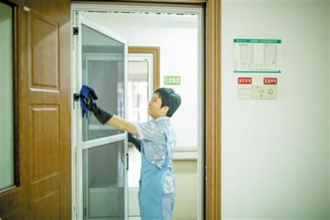早上,住在松鹤养老院老人们用过早餐后,负责松鹤楼2楼的护理员陈志佳收拾好一些需要护理的老人的碗筷后,马上开始了打扫房间的工作。每次日班,她需要负责打扫10个房间。