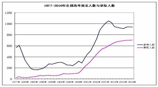 高考改变命运,其实只存在于精英教育时代。1977年,恢复高考第一年,570多万考生(实际上很多地方有预选考试,先筛掉一部分人,也就是说考生实际更多),只招收了20余万人,我们能想象这种比例筛选出来的人的就业与发展机会。历经10余年如此规模的演进,大学生确实是天之骄子。对于绝大多数人,高考也绝对可以改变命运,甚至是天翻地覆地改变。因为当时还处于完全的计划经济时代,80%以上的人仍然是农村户口,上了大学,就注定你进入了城市,有了干部身份。那是阶层的区别。