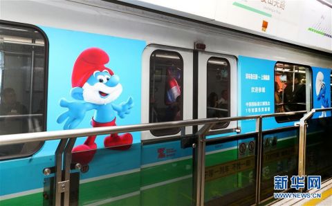 当日,一列中比主题地铁列车在上海地铁二号线首发。乘坐地铁前往进博会场馆国家会展中心(上海)的观众,将有机会搭乘到涂有比利时经典卡通形象蓝精灵的进博会主题列车。