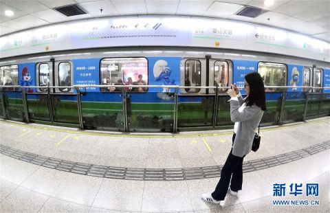 10月20日,一名乘客在站台上用手机拍摄涂有比利时经典卡通形象蓝精灵的上海地铁二号线列车。
