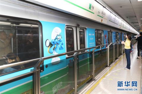 10月20日,一辆涂有比利时经典卡通形象蓝精灵的上海地铁二号线列车驶入车站。