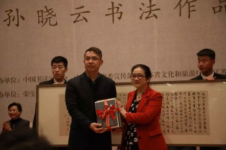 图为孙晓云(右)向国家博物馆赠送书法作品和作品集