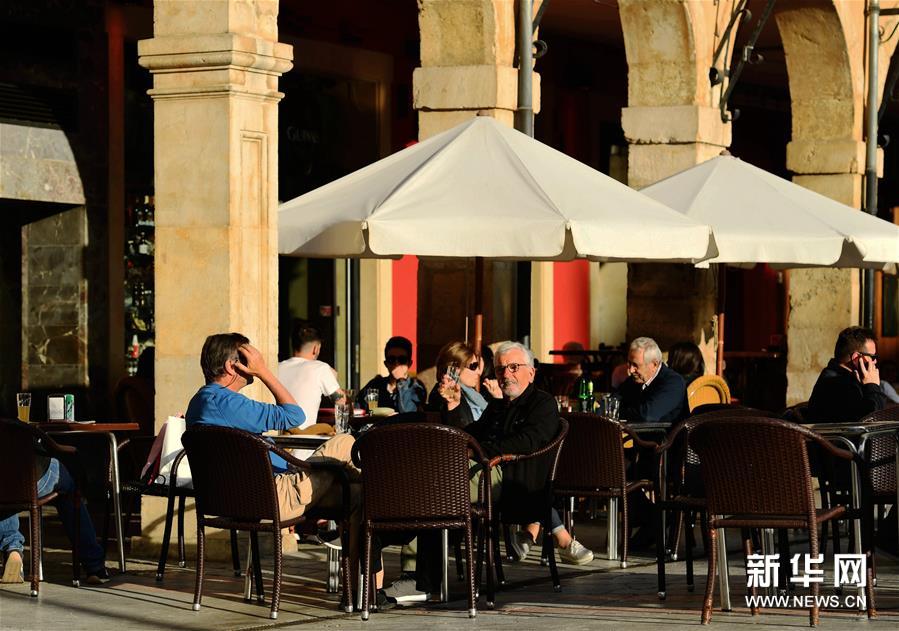 4月27日,人们在西班牙莱昂市的一处广场上休闲。莱昂省地处西班牙西北部,拥有壮丽的自然风光和丰富的人文资源。 新华社记者郭求达摄