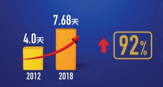 2018年,随着带薪休假制度的逐步落实,中国居民休闲时间也得到了保障。大调查与数据联盟伙伴中国社会科学院财经战略研究院联合课题组的测算发现,2018年中国人平均带薪休假天数已经达到了7.68天,比上一次调查(2012年调查结果4.0天)大幅提高了92%。