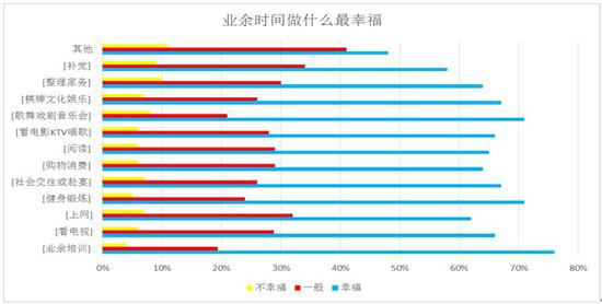 休闲时间做什么最能提升幸福感呢?大调查结果显示,休闲时间用来参加业余培训、健身锻炼和欣赏歌舞、戏剧、音乐会的受访者幸福感相对更高。身体健康,精神充实,幸福的日子一天比一天多。