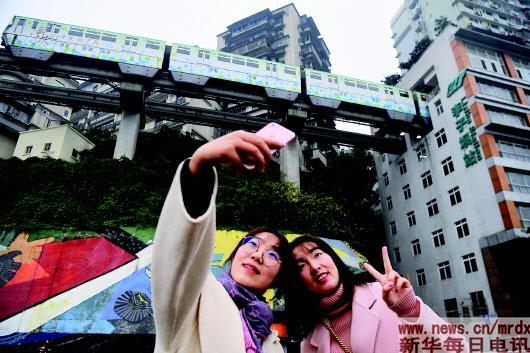 ▲1月26日,游客在重庆轻轨二号线李子坝站附近与穿楼而过的轻轨合影。记者王全超摄