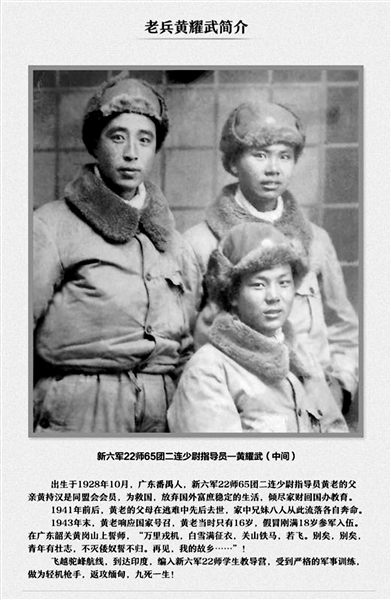 1943年,不足16岁的黄耀武和两名工友报名参军,因为自己年龄尚小,他假报年龄才得以参军,三人参军的故事还被当时的报纸报道。随后,黄耀武被编入远征军,1944年6月5日飞往印度,编入新六军22师学生教导营,作为轻机枪手参加了大部分缅甸战役的作战。抗战胜利后,黄耀武留在了辽宁,1949年11月,他在鞍钢耐火厂做成型工;1988年,他在沈阳低压开关厂退休。