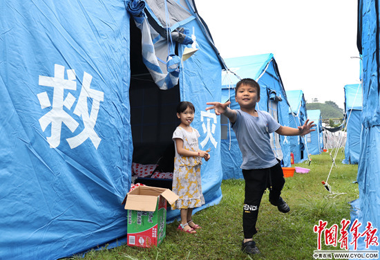 6月19日,四川省长宁县双河镇双河中学临时安置点,孩子们在帐篷间玩耍。中国青年报·中青在线记者 王鑫昕/摄