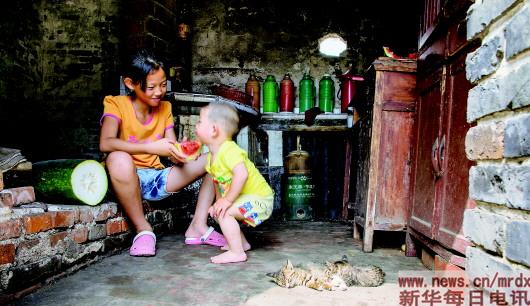 ▲2014年7月10日,南宋村,9岁的林晓雪(左)在喂2岁的弟弟吃西瓜。 记者李响摄