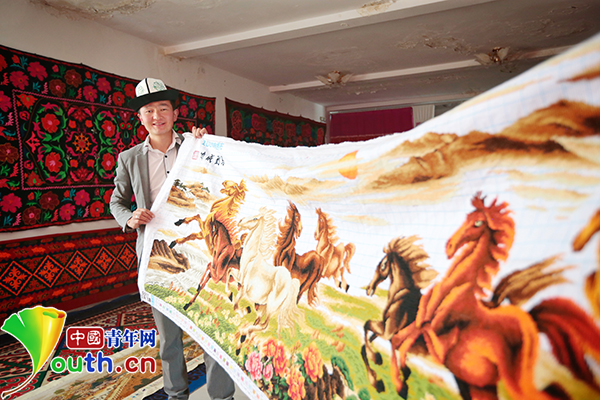 如今,合作社已经吸纳了建档立卡贫困户16人。合作社绣娘古丽沙旦·依力亚孜告诉中国青年网记者,柯尔克孜族姑娘出嫁,以前都是自己家缝制被褥等全套嫁妆,现在很多人都会选择来合作社购买制作精致的刺绣成品,一套嫁妆16条到30条被褥不等,每条刺绣被褥均价在500元左右,订购的越来越多,绣娘们也忙坏了。