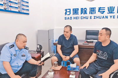 杨春(左一)在扫黑除恶专业队布置相关工作。资料照片